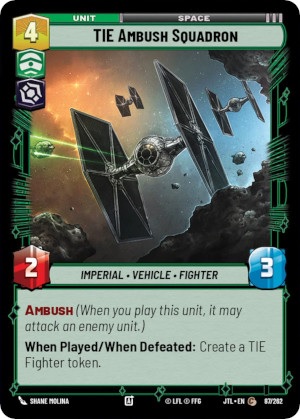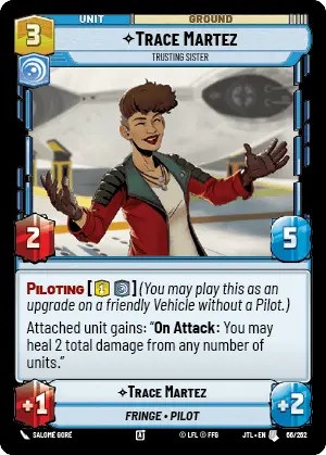 Darth Vader really wants you to go wide with your board within the realm of tokens. While there are plenty of ways to build your leader, Vader seems to be pushing toward the wide and aggressive board state. My recommendations for this leader? Trace Martez - Trusting Sister Wingman Victor Two - Mauler Mithel, Tie Ambush Squadron, Scramble Fighters, and Executor - Might of the Empire. REALLY put pressure on them in the air.