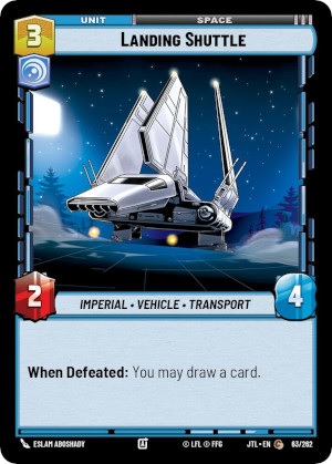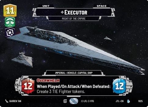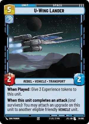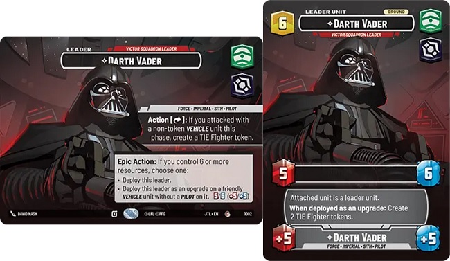 Darth Vader can be deployed as a leader or vehicle upgrade once you have 6 or more resources. When deployed as a leader unit, Darth Vader is simply a vanilla 5 power 6 health unit. However... when deployed as a unit upgrade, Darth Vader gives the vehicle that is upgraded +5/+5, makes it a leader unit, and gives that vehicle the ability "When deployed as an upgrade: create 2 TIE Fighter token".