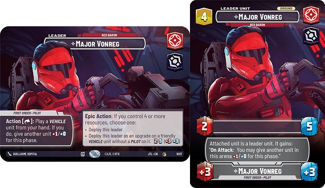 Major Vonreg is a leader that promotes heavily vehicle play with his leader ability or "Actions; Exhaust this leader: Play a vehicle card from your hand. If you do, give another unit +1/+0 for this phase." Vonreg's Epic Action allows him to be deployed as a leader unit as long as you have 4 or more resources. Of course, Major Vonreg is a Pilot so he can either be deployed as a vehicle upgrade or a regular unit. When Vonreg is deployed as a Leader Unit, he is jut a regular 2 power 5 toughness guy. However, if Major Vonreg is deployed as an vehicle upgrade he turns that vehicle into a leader unit and gives it +3/+3 with the ability of "On Attack : You may give another unit in this arena +1/+0 for this phase."
