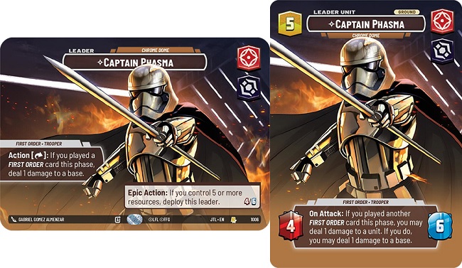Captain Phasma is a rare leader that you can deploy as a Leader Unit , as an Epic Action, once you hit 5 or more resources. Captain Phasma's leader ability is "Action; Exhaust this leader: If you played a first order card this phase, deal 1 damage to a base." Unlike Major Vonreg, Captain Phasma does not have the Pilot ability. So, Phasma can only deploy as a leader unit. Once she is deployed as a Leader Unit, Captain Phasma is a 4 power and 6 health leader with the following ability "On Attack: If you played another First Order card this phase, you may deal 1 damage to a unit. If you do, deal 1 damage to a base."