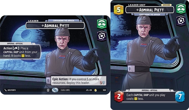 Admiral Piett is a very straight forward leader with the leader ability of "Actions; exhaust this leader: Play a Capital Ship from your hand. It cost 1 resource less." Admiral Piett also flips once you have achieved 5 or more resources as an epic action. Admiral Piett's unit side is a 2 power 7 health unit with "Each Capital Ship you play costs 2 resources less." If you flip Piett, guarantee that you can capitalize on his unit ability as much as possible. Steer clear of that removal, and ensure your big ole hunks of metal are more threatening than your opponents!