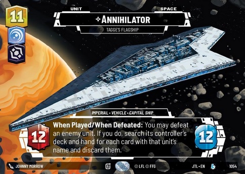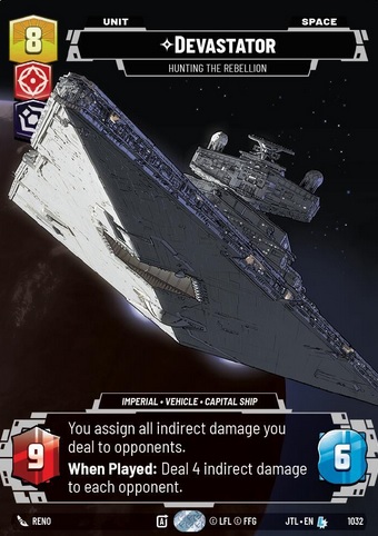 Boba Fett not only bundles indirect damage on top of indirect damage, but he also can REALLY Buff a vehicle, or even a Capitol Ship, into a huge unit. +4/+4 to a unit with immediate damage on upgrade is no small feat. That could be three of your opponents units down and one big ole hunk of ship left for you. Just a few examples of capital ships coming out of JTL that Boba can make even bigger (and I definitely recommend these cards based off your base's aspects) are Chimaera - Reinforcing the Center, Annihilator - Tagge's Flagship, Victor Leader - Leading from the Front, Ig-2000, and Radiant VII.