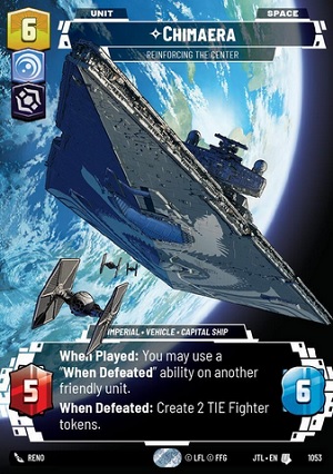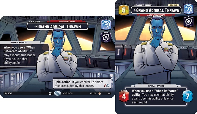 Grand Admiral Thrawn has a static leader ability of "When you use a 'When defeated' ability; You may exhaust this leader. If you do, use that ability again." Grand Admiral Thrawn flips to his unit side at 6 resources with the exact same ability but with 4 power and 7 Health.