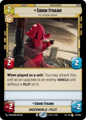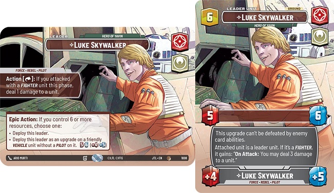 Poe Dameron's pilot upgrade side reads as such "Actions ; Exhaust one resource : Attach this upgrade to a friendly Vehicle unit without a Pilot on it." and provides the upgraded unit with +2 power and +1 health. Some important things to note with this upgrade, and leader ability.... The Leader ability is not an Epic Action, so this function can be utilizing multiple times within a game. The Upgrade also does not turn the upgraded vehicle unit to a Leader-Unit meaning removal pieces that specify "A non-leader unit" can still target the upgraded unit. Even so, once you reach 5 or more resources, you flip Poe Dameron to his Leader-Unit side as an Epic action. Poe Dameron's leader unit is just a vanilla 4 power 6 health ground unit.
