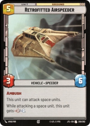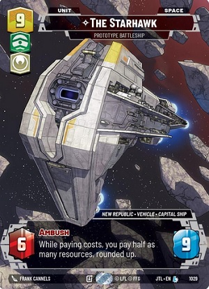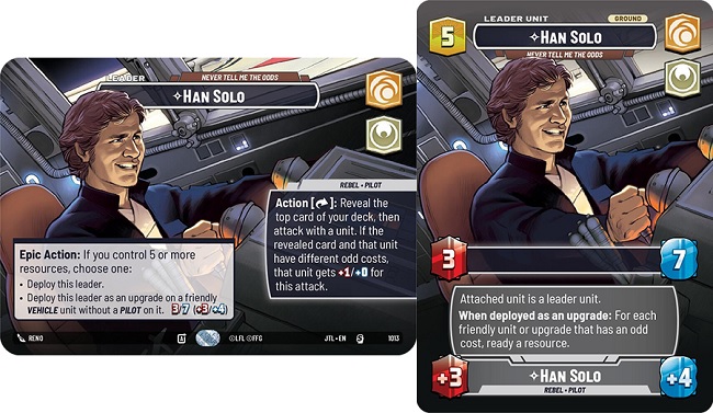 Han Solo has a leader ability of "Action: Exhaust this Leader: Reveal the top card of your deck, then attack with a unit. If the revealed card and unit have different odd costs, that unit gets +1/+0 for this attack." Once you have 5 or more available resources, Han Solo can be deployed either to a Leader Unit or a Vehicle Upgrade. When deployed as a leader unit, Han Solo is a vanilla 3 power 7 health unit. However, as an upgrade Han Solo reads as " Attached unit is a leader unit. When deployed asn an upgrade: For each friendly unit or upgrade that has an odd cost, ready a resource." This is definitely Unique.... Certainly, odd. We want Odd costs and Odd things within Solo, and we can utilize our resources based off odd costs to bring out more things. What things could they be? Lets go over some excellent options of THINGS we could put into a Han Solo deck from Jump to Lightspeed.