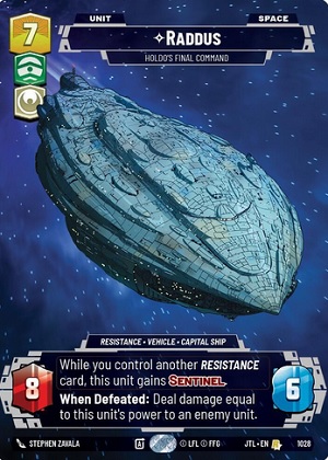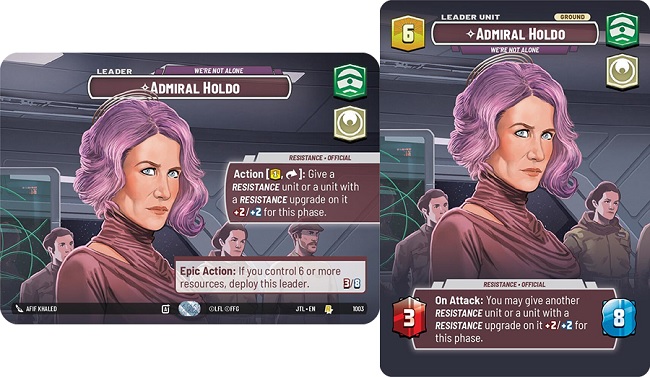 Admiral Holdo is a resistance / official leader that has the leader ability of " Exhaust one resource; exhaust this leader: Give a Resistance unit or a unit with a Resistance upgrade +2/+2 for this phase." . It is important to note that Holdo states for the phase, not the turn. Admiral Holdo also has an Epic Action that you can activate as long as you have six or more available resources and allow you to deploy Admiral Holdo as a leader unit. Admiral Holdo's leader unit reads as follows "On Attack: You may give another Resistance unit or a unit with a Resistance upgrade on it +2/+2 for the phase" with 3 power and 8 health. Holdo pretty much does the same on her unit side as she does as a leader and, much like some of the other leaders we have discussed today, wants you to play with Resistance units. Fairly straight forward as far as leader effects go; Play a resistance unit, buff them, swing them. So... what cards go well with Admiral Holdo?