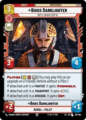 Wedge Antilles is our Pilot leader for Command and has the leader ability "Action; exhaust this leader; Play a card from your hand using Piloting. It cost 1 resource less for the phase." As long as you have 5 or more available resources, Wedge can deploy as either a Leader unit or a Vehicle upgrade. When deployed as a leader unit, Wedge is a vanilla 3 power and 6 health unit. However, Wedge's piloting upgrade reads as follows " On Attack; The next Pilot card you play this phase cost one resource less to play." So... Wedge demands that we play pilot. His upgrade specifies Pilots but his leader ability specifies the Pilotting ability making him oddly versatile yet... restricting? Lets talk about some excellent Pilots that would work very well with Wedge.