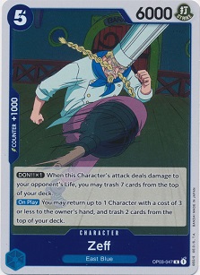 Zeff is a 5-cost 6000-power character with "On play, you may return one character with a cost of 3 or less to its owner's hand, and trash 2 cards from the top of your deck." and "DON!!X1 when this character's attack deals damage to your opponent's life, you may trash 7 cards from the top of your deck." Head Chef Zeff isn't just a tall hat; he brings a wide variety of dishes to the table. His On Play ability can bounce Kaya back to your hand, which allows you trash two cards and potentially play Kaya again to draw another 2 cards to your hand, thinning out your library by 4. Zeff can even work as removal for a threat on your opponent's board AND allow you to trash two from your library. Ideally, you draw your card per turn, drop Kaya, draw two trash two, play Zeff, put Kaya back in hand and trash the top two, play Kaya again, draw two trash two, and suddenly you've gone through 7 cards in your library right there for the cost of 7 DON!!.