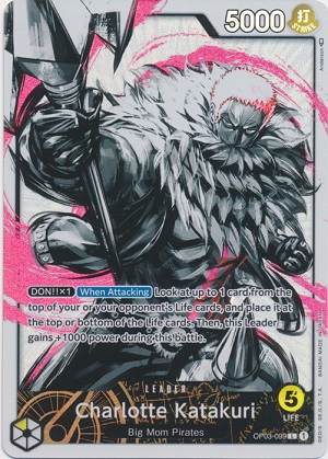 Katakuri is another leader, like Smoker, that was given some support from a Starter deck recently and also has a similar ability to Smokers just... much more guaranteed. Katakuri allows you to manipulate the top or bottom of your life, or your opponent's life, as long as you put a DON!! On him when attacking. After you've look at the chosen life cards, Katakuri gains +1000 power for the attack. Another leader that really requires the opponent to have +3000 counter to keep something around, but he continues to uphold potential and will be missed.