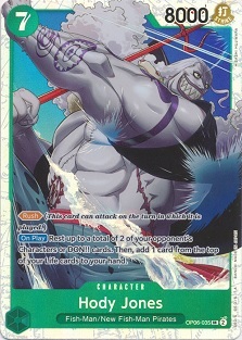 Moving on to Hody Jones who has more of a... controlling aspect of Green to him. Hody jones is a 7-drop 8000 power character with Rush that on play rest either 2 of your opponent's DON!! or characters, clearing the path for an 8000 power attack toward your opponent.
