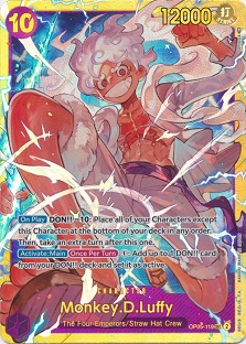 Enter Monkey .D. Luffy. Talk about a card that practically embodies high risk high reward. Luffy is a 10 cost 12000 power character that On Play you can return all 10 of your DON!! back to your DON!! deck and remove all characters besides Luffy from your field to the grave and then take an extra turn after the current turn Luffy was played in. Luffy also has an ability of pay 1 DON!! and add up to one DON!! card from your DON!! deck as active. In many ways, this Luffy is HUGE... but he functions perfectly as a finisher. The last thing you want to do is play this card with a phenomenal board state only to wipe your own board clean and not finish off your opponent with your extra turn, right?