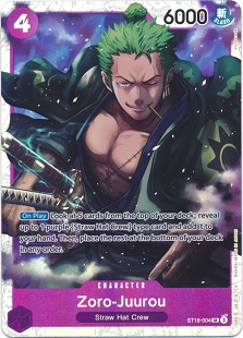 Roronoa Zoro is a 4 cost 5000 power Character with the following abilities "If your opponent has 2 or more characters, this Character can attack Characters on the turn in which it is played." and "[On Play] If your Leader has the 'Straw Hat Crew' type, rest up to 1 of your opponent's Characters with a cost of 4 or less."