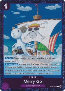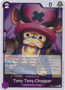 Monkey .D. Luffy is a ramp-esque leader that want to play rather aggressively with 6000+ characters like Zoro-Juroo from Starter deck 18, Uso-hachi and Fra-Nosuke as +2000 counters and the Merry Go stage as protection for these higher powered characters. Some decks run Tony Tony Chopper from set 7 but it's worth noting... this Chopper is NOT a "Straw Hat Crew" character.