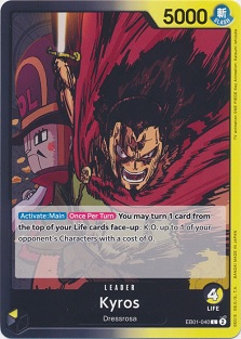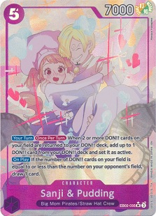 This character is a 5 DON!! Cost 7000 power purple character with two different abilities. The first is "[Your Turn][Once Per Turn] When 2 or more DON!! cards on your field are returned to your DON!! deck, add up to 1 DON!! card from your DON!! deck and set is as active" as well as the ability "[On Play] If the number of DON!! cards on your field is equal to or less than the number on your opponent's field, draw 1 card."