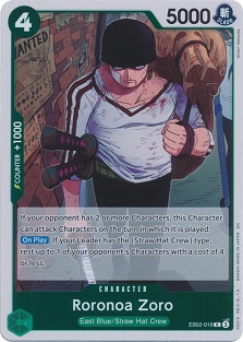 Zoro has pseudo-Rush and can come in hot from Luffy leader and get rid of an opposing character. Also worth noting, unlike Sanji & Pudding, Zoro won't brick up your hand. Zoro is a +1000 counter in hand as well.