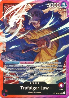 Removal now and forever will be a mainstay in One Piece decks, and both banned Sakazuki and Red/Purple Law support removal. However, in Law's case, he IS removal. Regardless of Law's conditional removal actions, Bandai has an opportunity to limit the quality of Red/Purple Law play by banning or restricting characters.