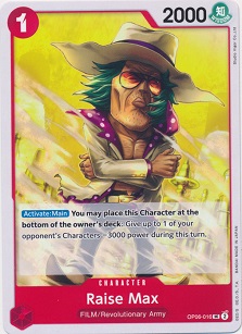 Law has the inherent ability to remove vital characters such as Fukuro, Rebecca, Killer (Set 1), Sugar, and Set 6 Marguerite. Most of these examples are blockers, but being able to remove these characters from the board makes it easier for attackers to hit your life. However, these are just 3000 power or less characters. Red has plenty of ways to reduce the power of other characters. Namely, Law often utilizes characters such as Gordon or Raise Max, which allow Law to remove a 6000 power or less character after utilizing these characters' abilities.