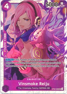 With blockers being cleared, it isn't a challenge for Law to knock their opponent down to 2 life cards. But as previously stated, rush characters aren't the only ones that maximize efficiency with Law. Commonly used characters in Law decks for utility include Shachi and Penguin, which have the required 5000 power and return two DON!! from your DON!! Deck, meaning you've effectively paid 1 DON!! for a 5000 power body. Additionally, Vinsmoke Reiju can be used in case you need to draw some answers; Reiju is also a 5000 power body with "[On Play] If the number of DON!! cards on your field is equal to or less than the number on your opponent's field and you have 5 or less cards in your hand, draw 2 cards." In Law, you won't intentionally be matching the same amount of DON!! as your opponent.