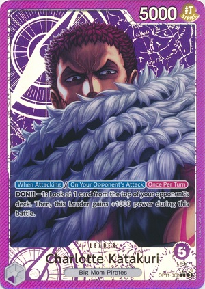 Charlotte Katakuri is a 5000-power purple leader with the standard stat of 5 life and the following leader ability: " [When Attacking]/[On Your Opponent's Attack] [Once Per Turn] DON!! -1 Look at 1 card from the top of your opponent's deck. Then, this leader gains +1000 power during this battle."