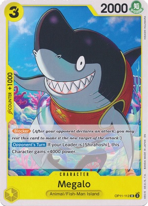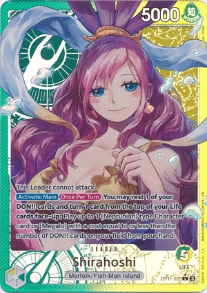 Shirahoshi is a Green/Yellow leader with abnormal stats unlike what we would normally see in a multicolored leader. Shirahoshi has 5000 power and 5 life and has the static ability of "This Leader cannot attack" and the leader ability of "[Activate: Main][Once Per Turn] You may rest 1 of your DON!! cards and turn one card from the top of your Life cards face-up: Play up to 1 'Neptunian' type Character card or 'Megalo' with a cost equal to or less than the number of DON!! cards on your field from your hand." So, sure, there is a drawback to having five life since it comes at the cost of your leader attacking. But we've seen this before in leaders such as Nefeltari Vivi, Rebecca and Dr.Vegapunk. Also, just to clear the air, Megalo is this lil guy - NOT a Character type - fellow seafarers.
