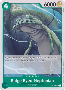 Please, please! Keep your hands off the glass; these are the LAST Creatures we want to startle. The Bulge-Eyed Neptunian is a 4-cost 6000-power character with a static ability that really only triggers once, but that's all we need. The Bulge-Eyed Neptunian has the following ability: "If your Leader is 'Shirahoshi', this Character can attack Characters on the turn in which it is played.". So... Once again like some Jinbe pieces, pseudo rush. Imagine, turn 2 you play this guy from your hand sending its actual cost and then play a second one using Shirahoshi's ability? Listen, two 6000 power bodies on turn two doesn't sound bad to me. As long as our Princess is going second, that is.