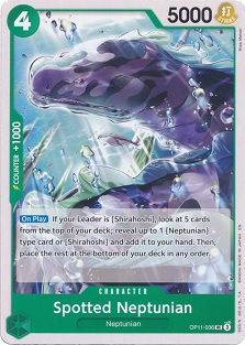 Catch some of the spots on the "Spotted Neptunian." The Spotted Neptunian is a 4-cost 5000-power character that also has +1000 counter on it and has the following ability: "[On Play] If your Leader is 'Shirahoshi', look a 5 cards from the top of your deck; reveal up to 1 'Neptunian' type card or 'Shirahoshi' and add it to your hand. Then, place the rest at the bottom of your deck in any order." Okay, so we are going to talk about other Shirahoshi cards today. But this is a rather large body for a searcher character that can potentially help us get the card we need for our next play. You could say he... hits the spot.