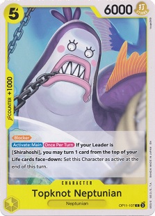 However from Eyes and Spots neither of those Neptunians are the Topknot, and I mean that VERY litteral. The last Neptunian to go over in this metaphorical fish tank is none other than the Topknot Neptunian. This Character is a 5-cost 6000-power character with a +1000 counter and blocker. The Topknot Neptunian also has the following ability "[Activate: Main][Once Per Turn] If your Leader is 'Shirahoshi', you may turn one card from the top of your Life cards face-down: Set this Character as active at the end of this turn." While this ability does not cause the Topknot to turn active immediately, it also comes at such a small cost of flipping a life-card face down just to turn the Topknot as active so they can block after attacking into your opponent with 6000 power.