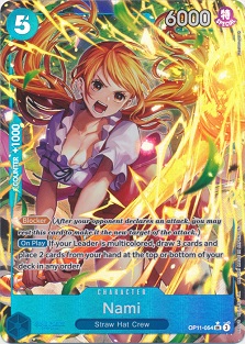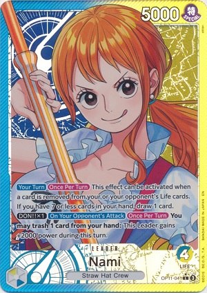 For Clarity, this Nami is not another alternate win-con leader like Set 3 Nami is. However, this Nami is a blue/yellow leader that upholds the standards stats for a multicolored leader with 5000 power and 4 life and has MULTIPLE Leader abilities. Her first leader ability reads as follows "[Your Turn][Once Per Turn] This effect can be activated when a card is removed from your or your opponent's Life cards. If you have 7 or less cards in your hand, draw 1 card." and her other ability is "[DON!!x1][On Your Opponent's Attack][Once Per Turn] You may trash 1 card from your hand: This Leader gains +2000 power during this turn."