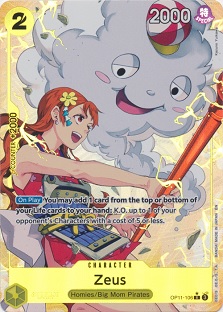 Starting off with that first ability, the card draw for this leader is insane. And requiring 7 cards in hand for it to pop is excellent. You will most likely be able to refill your hand easily if you are using counters from hand to counter out attacks, and even if you aren't and you've got bricks in hand you can pitch some unwanted bricks to her ability. She is another hard to kill yellow leader, just with some spicy card draw-esque Abilities. She is our first straw hat leader out of the two we will be seing this set... so, what support is brought to this Leader out of Set 11? We'll go over two of them for now... those being Zeus - and because every leader has to have one, character Nami.