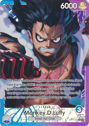 Monkey .D. Luffy is a Blue and purple leader that, like Shirahoshi, does not uphold the standard stats for a multicolored leader. Monkey .D. Luffy is a 6000 power leader with 3 life and has the following ability: "This effect can be activated at the start of your turn. If you have 8 or more DON!! Cards on your field, look at 5 cards from the top of your deck; reveal up to 1 'Straw Hat Crew' type card and add it to your hand. Then, place the rest at the top or bottom of the deck in any order."