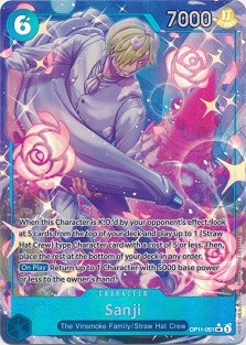 Sanji is a 6-cost character with 7000 power and the following abilities "When this Character is K.O.'d by your opponent's effect, look at 5 cards from the top of your deck and play up to 1 'Straw Hat Crew' type Character card with a cost of 5 or less. Then, place the rest at the bottom of your deck in any order." as well as "[On Play] Return up to 1 Character with 5000 base power or less to the owner's hand"