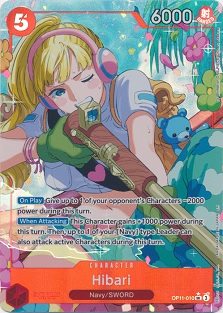 Hibari is a 5 cost 6000 power character that has two abilities. The first being "[On Play] Give up to 1 of your opponent's characters -2000 power during this turn." and the other being "[When Attacking] This Character gains +1000 power during this turn. Then, up to 1 of your 'Navy' type Leader can also attack active characters during this turn."