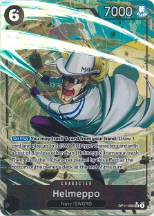 Helmeppo is a 6-cost 7000-power black character with the following ability "[On Play] You may trash 1 card from your hand: Draw 1 card and play up to 1 'SWORD' type character card with a cost of 8 or less other than 'Helmeppo' from your trash. Then, place the 1 character played by this effect at the bottom of the owner's deck at the end of this turn." With Helmeppo, you can just pitch a "SWORD" character from your hand that you might not want to wait until next turn to play and just go ahead and get them out and swing with them into a character at the bare minimum (Since they are a "SWORD" type character and Koby leader allows them to do that) but... I suppose you could just go for On Play effects as well, but I personally wouldn't. You know what I would do though?