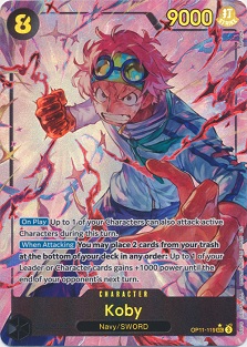 Koby is a Red/Black leader that follows the standard statistics for a multicolored leader with 5000 power and 4 life. Koby has a static ability tied to his leader card as well as another ability. Koby's static ability is "Your 'SWORD' type Characters can attack Characters on the turn in which they are played" as well as his other ability of "[Once Per Turn] If your 'Navy' type Character with 7000 base power or less would be removed from the field by your opponent's effect, you may place 3 cards from your trash at the bottom of your deck in any order instead."