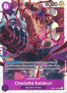Charlotte Katakuri - Character - is a 8 cost 8000 power character with blocker and the following ability "[End of your turn] Set up to 2 of your 'Big Mom Pirates' type Characters with a cost of 3 or more as active. Then, add up to 1 DON!! card from your DON!! deck and rest it," which allows you to attack with your Big Mom Characters and then restand them so they aren't as easily removed by combat or green effects that would K.O. a rested character.