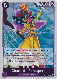 Charlotte Perospero is a 5-cost 7000-power character with the ability of "[Activate:Main][Once Per Turn} You may trash 1 card from your hand: Choose a cost and reveal 1 card from the top of your opponent's deck. If the revealed card has the chosen cost, draw 1 card and add up to 1 DON!! card from your DON!! deck and set it as active." Ultimately, Perospero allows you to further manipulate your DON!! With Katakuri's ability while also being a 7000-power body.