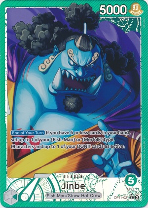 Jinbe is a Mono-Green leader with the standard stats of 5000 power and 5 life and has the following leader ability "[End of Your Turn] If you have 6 or less cards in your hand, set up to 1 of your 'Fish-Man' or 'Merfolk' type Characters and up to 1 of your DON!! cards as active." We've seen Fish-Man based leaders in the past, namely with Hody Jones. Our first introduction to any Fish-Man leader was Arlong from set 3 but he wasn't a "Fish-Man" specific leader as much as he interacted with triggers. I really like how this leader doesn't just interact with only Fish-Man characters but also Merfolk AS WELL as he allows you to set a DON!! as active, but it's all dependent on hand size. The dependency on hand size can be a detriment when it comes to attempting to counter out things with the limited hand size as a pay off for leader ability, but then again we start with five cards in hand as One Piece players right? So... it's a bit of a toss up. It's also worth noting that Jinbe is a "Straw Hat Crew" leader which means he synergies with cards that require a "Straw Hat Crew" leader as well.
