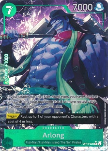 Set 11 also brings us a new Arlong character. Arlong is a 7-cost 7000-power character with +1000 counter and the following ability "If your Leader has the 'Fish-man' type, you have 3 or less Life cards and your opponent has 5 or more rested cards, give this card in your hand -3 cost" and a trigger that reads "Rest up to 1 of your opponent's Characters with a cost of 4 or less." While I am sure this Arlong character was also intended to be used by Arlong Leader, this is an interesting concept. There are a lot of components to make this character go from costing 7 DON!! to 4 DON!!. But for Jinbe, if you are taking life cards it might be a bit easier to play Arlong out for the discounted price to ensure you've got a 7000 power body on the field and then some more DON!! for your liking.