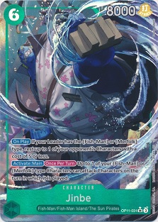 Jinbe Character is a 6 DON!! cost character with 8000 power and has the following abilities "[On Play] If your Leader has the 'Fish-man' or 'Merfolk' type, rest up to 1 of your opponent's Characters with a cost of 5 or less." and "[Activate:Main][Once Per Turn] Up to 1 of your 'Fish-man' or 'Merfolk' type Characters can attack Characters on the turn in which it is played." So, Jinbe isn't only pure value in the fact that he is a 6 cost 8000 power body but he also can enable one of your other characters to be able to attack other characters AS SOON as they hit the field. He doesn't specify "active characters" he just states "characters" in general. It's not rush, but it's certainly not nothing.