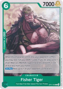 Fisher Tiger synergizes very well with Jinbe since Jinbe's ability allows us to unrest a DON!! At the end of turn and he also replaces himself with a smaller cost character as long as he is removed by an effect. There also isn't a cost restriction on his On Play ability making him very versatile in what he can eliminate as a potential blocker or a character we might just need to get rid of.