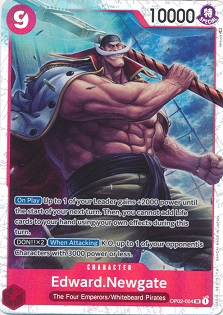 Starting out with Number 5 we have Edward.Newgate, or properly nicknamed 9beard. Edward.Newgate is a 9 cost 10,000 power character with "[On Play] Up to 1 of your Leader gains +2000 power until the start of your next turn. Then, you cannot add Life cards to your hand using your own effects during this turn." and "[DON!! x2] [When Attacking] K.O. up to 1 of your opponent's Characters with 3000 power or less." Edward.Newgate clearly has a lot of power behind him, but his high cost of 9 DON!! and the current state of Red in the meta being Red/Purple Law utilizing mostly 4-cost cards or lower has put this powerhouse in 5th. Edward.Newgate's worst case scenario is that you have rested 9 DON!! To give your Leader +2000 power until your next turn and you have a 10,000 power body. In contrast, the best case scenario for Edward.Newgate character is that you Buff your leader +2000, swing in for 12,000 next turn, and K.O. a lower power character with the swing. Currently, 9Beard is just a high risk/high reward character within the meta.