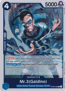 Mr.3, as crafty as he is, is a 4 cost 5000 power blocker with "[Blocker] (After your opponent declares an attack, you may rest this card to make it the new target of the attack.) [End of Your Turn] You may trash 1 card from your hand: Set this Character as active.". While at first glance Mr.3 doesn't seem all that great, remember that he can function as an attacker as well as a blocker given the right circumstances. For example, if your hand is just gummed up with unnecessary cards or you really need to get in for quick damage while on the defense, you can pitch a seemingly irrelevant card to Mr.3 at the end of turn after attacking and switch him back into active status for blocking purposes.