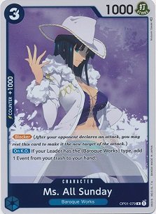 Further down the list we have from Set 1 Ms.All Sunday, or more commonly known as Nico Robin, who is a 3 cost 1000 power blocker, and a +1000 counter, with "[Blocker] (After your opponent declares an attack, you may rest this card to make it the new target of the attack.) [On K.O.] If your Leader has the {Baroque Works} type, add up to 1 Event from your trash to your hand." So, if you really needed those events that were discarded to Mr.3's ability, or if you just want to return past events that proved useful? Drop Ms. All Sunday to improve your defenses and then get back the events you have missed so much since you last played it. While returning an event may not prove very synergistic for us, it does show utility and widen our options when the right situation reveals itself. Bring back all the removal your heart desires!