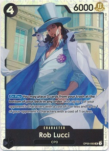 Moreover, while Rob Lucci is part of the CP0 subtype, his ability isn't limited to returning only CP cards. You can return Thriller Bark, Navy, Dressrosa - any subtype card, not just characters - from your trash to the bottom of your deck to activate his On Play ability. Did you throw Isshou and Absalom from your hand or library into your trash? No problem. Pay 4 DON!!, play Rob Lucci, and return them to the bottom of your deck to draw at a later point. Want the possibility of playing Finger Gun one more time, but all your copies are in the trash? Again, not a problem! Play Rob Lucci, put your desired cards back in your deck, and remove some threats after reducing their cost. Rob Lucci proves to be a powerful asset in any deck and continues to see play in ANY deck that includes Black.