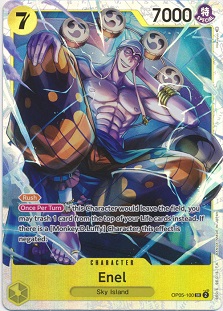 In third place, we have the long-limbed, barefooted, lightning rod man himself, Enel. Both Enel and Lucci leaders have been running rampant lately, and make no mistake - this character holds power similar to his leader counterpart. Enel is a 7-cost, 7,000 power character with Rush and the ability: "[Once Per Turn] If this character would leave the field, you may trash 1 card from the top of your Life cards instead. If there is a [Monkey D. Luffy] character, this effect is negated." While this ability is conditional, with many Luffys in the OPTCG to contend with, it's important to note that it says "would leave the field," not "when K.O.'d." This means cards like Gravity Blade Raging Tiger, Ten Thousand Worlds, or any other effect that would place Enel in the owner's hand or at the bottom of their deck, rather than in the trash, will also trigger this ability. This synergizes well with Enel leader, requiring your opponent to hit you three times just to try and get a win.