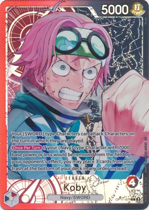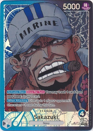 Usopp and Starter deck 14 Monkey .D. Luffy are both excellent examples of cost increase leaders that began to see pay because of Sakazuki, and leaders like Koby and Sabo have built in protection for their characters. Even so, Sakazuki being able to filter cards and his built-in cost reduction on a two-color leader (both of which specialize in removal) eventually made him overwhelming. So, Sakazuki got the ban hammer. And now, he returns. As beautiful as the day I - I mean WE - lost him.