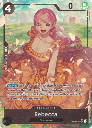 Rebecca? She's a blocker, and an excellent one that brings a Black back character to hand and puts a Black character of Cost 3 or less from your hand into play for free rested. Blocker, recursion, free play character: nothing but value form Rebecca. With the revival of Sakazuki, and new cards like Jozu, Tashigi, and some pieces coming out of Legacy of the Master clearly meant for Blue Kuzan leader, you can expect to see Sakazuki making another rise to the top.