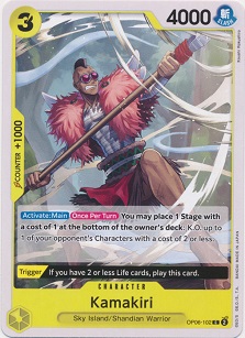 Let's leave the sea behind and soar toward the Sky Islands, where Kalgara leads. In a previous set review, we covered Kalgara in depth, but today we'll compare his playstyle to Arlong's. Arlong's ability allows you to play a 4-cost or lower character with a trigger, but Kalgara's ability reads: "[DON!! x1] [When Attacking] Play up to 1 {Shandian Warrior} character from your hand with a cost equal to or less than the number of DON!! on your field. If you do, add 1 card from the top of your Life cards to your hand." Kalgara's ability is less costly than Arlong's, but it decreases your life and limits your plays to Shandian Warriors.