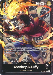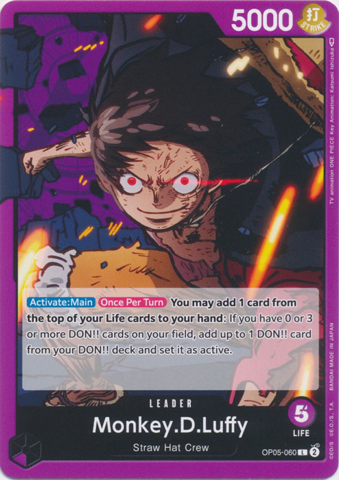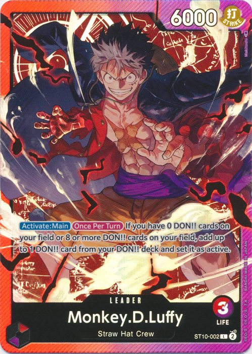 Luffy's experience throughout all of his adventures is reflected in the many different-colored Luffy leaders. From the Set 1 Red/Green Luffy leader to even the promotional Blue Luffy leader, he remains flexible, able to expand his horizons toward other strategies within the One Piece Trading Card Game.