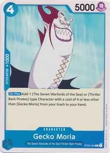 Gecko Moria is a 4 cost 5000 power character, so you are able to play him off Doflamingo ability, that allows you to grab a Seven Warlord of the Sea character with a cost 4 or less from your grave to your hand on play. This means you could grab the previously mentioned cards from your grave to play later during your current turn or on a later turn. Long-term planning.